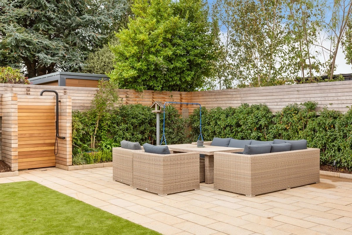 The rear garden, extending to approximately 55ft x 40ft, is both private and versatile, featuring a substantial garage and a convenient outdoor shower area. To the front, the property benefits from off-street parking via a private driveway.